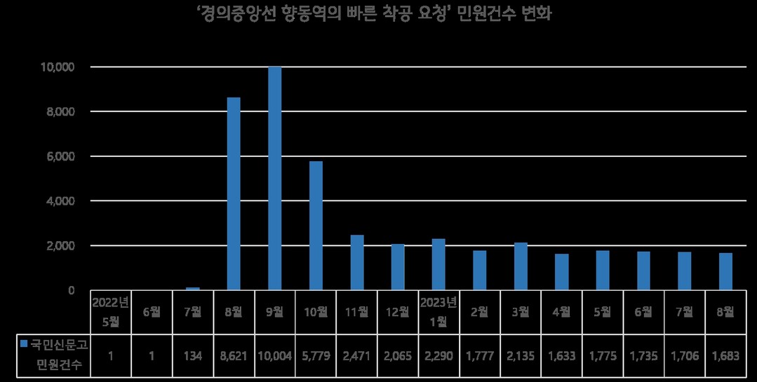국민신문고 빈발민원 중 가장 많이 접수된 민원은 ‘경의중앙선 향동역의 빠른 착공 요청’ 민원으로, 8월 한 달 간 1,696건 접수되었다. 이 민원은 2022년 8월부터 현재까지 1년간 가장 빈번하게 접수되고 있는 민원이다.
