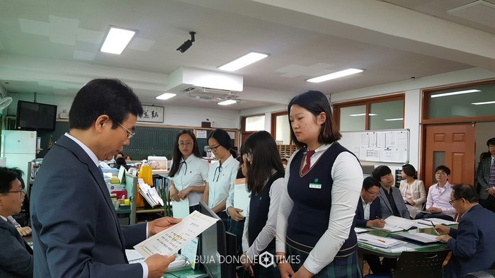 광주동신여자고등학교(교장 손해근) 교직원 제자사랑장학회가 15일 스승의 날을 맞이해 가정형편이 어려운 제자들에게 장학금을 지급했다.