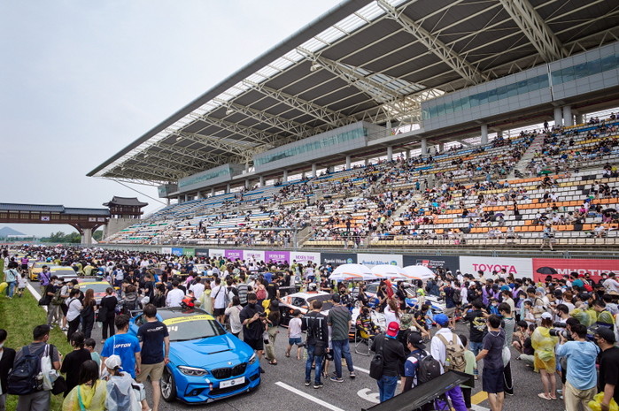 [사진설명] 그리드워크 시간에 레이스카가 질주하는 서킷을 직접 걸어다니며 레이스카와 선수를 만나보고 있는 관람객들.