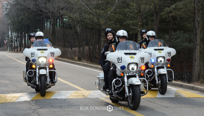 국방일보 '좌충우돌 병영체험'에 참가한 KBS 김지효(왼쪽부터), 장주희, 강아랑 기상캐스터가 10일 서울 관악구 수도방위사령부 헌병단에서 기동대 뒷자석에 탑승해 출동하고 있다. 2017.01.15. (사진=국방일보 제공)