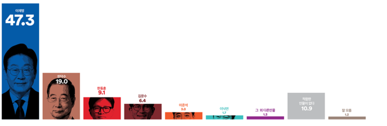 대선주자 적합도,‘이재명’ 47.3%로 압도적 1위, ‘한덕수’ 19.0%로 2위(격차 28.3%)