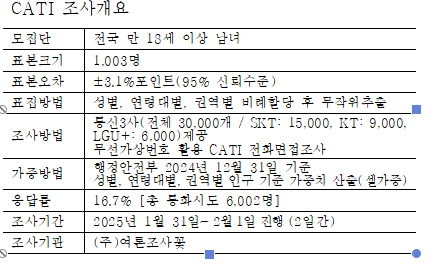 ‘여론조사꽃’이 2025년 1월 31일부터 2월 1일까지 이틀간 실시한 전화면접조사에서 ‘더불어민주당’의 지지율은 지난 조사 대비 7.2%p 상승한 50.4%를 기록했다. 반면, ‘국민의힘’은 3.8%p 하락한 34.3%로 집계되었다. ‘조국혁신당’의 지지율은 2.1%p 하락한 3.5%로 최저치를 기록했다. 양당 간 격차는 지난 조사 격차인 5.1%p에서 16.1%p로 크게 확대되었다. ‘더불어민주당’과 ‘조국혁신당’의 합산 지지율(53.9%)은 ‘국민의힘’보다 19.6%p 앞선 것으로 나타났다.
