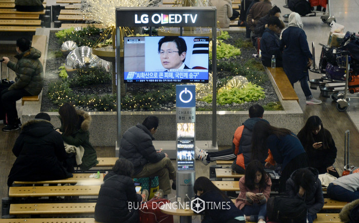 23일 오전 인천공항 도착장에서 여행객들이 황교안 대통령 권한대행 국무총리의 신년 기자회견을 생방송으로 지켜보고 있다. 2017.01.23.