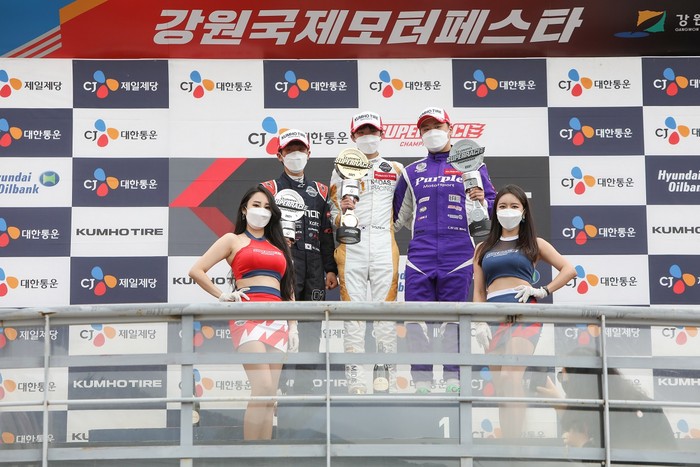 [사진설명] 20시즌 e슈퍼레이스 챔프 김규민(가운데)과 정규8위 이창욱(오른쪽)이 올해 실제 레이싱 포디움에 함께 올랐다.