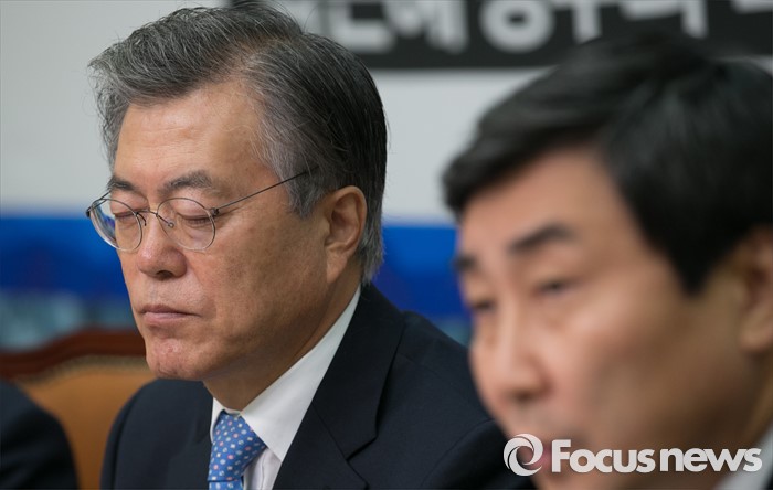 △ 문재인(왼쪽) 새정치민주연합 대표가 13일 오전 서울 여의도 국회에서 열린 확대간부회의에 참석해 이종걸 원내대표의 모두발언을 들으며 생각에 잠겨 있다. <사진제공=포커스뉴스>
