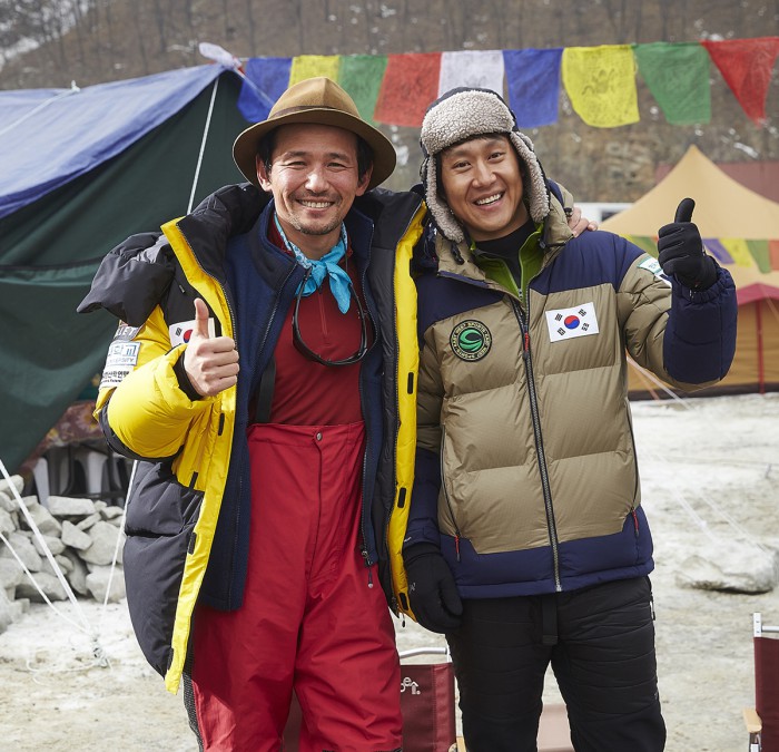| △ 영화 '히말라야'에서 엄홍길 대장과 박무택 대원으로 변신하는 황정민, 정우(좌측부터)가 현장에서 환한 미소를 짓고 있다. <사진제공=CJ엔터테인먼트> |