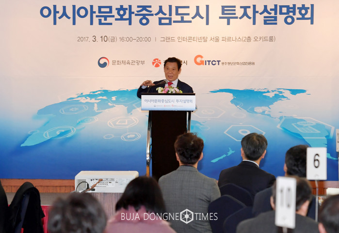 윤장현 광주시장은 10일 오후 서울 그랜드인터넨탈 호텔에서 광주광역시와 문화체육관광부가 공동으로 마련한 '아시아문화중심도시 서울 투자설명회'에 참석해 인사말을 했다.