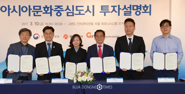 | △윤장현 광주광역시장이 '아시아문화중심도시 서울 투자설명회'에 참석해 광주광역시·문화체육관광부·마그나인베스트먼트(주)와 투자진흥지구 및 광주문화산업 투자활성화를 위한 참가 업체들과 업무협약을 체결하고 있다 |