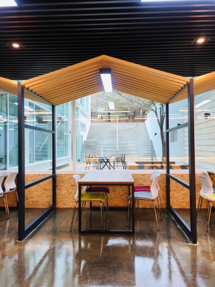 디노스페이스는 열린책공간(Book)-B, 큰모둠방(Discussion Room)-D, 시청각실(Multi-Room)-M, 도시락방(Food)-F, 작은모둠방(Cafeteria)-C, 창업연구공간(Lab)-L, 야외쉼터로 구성했다.