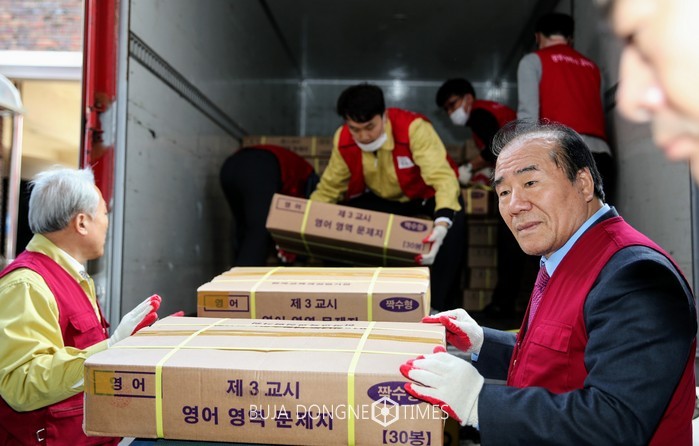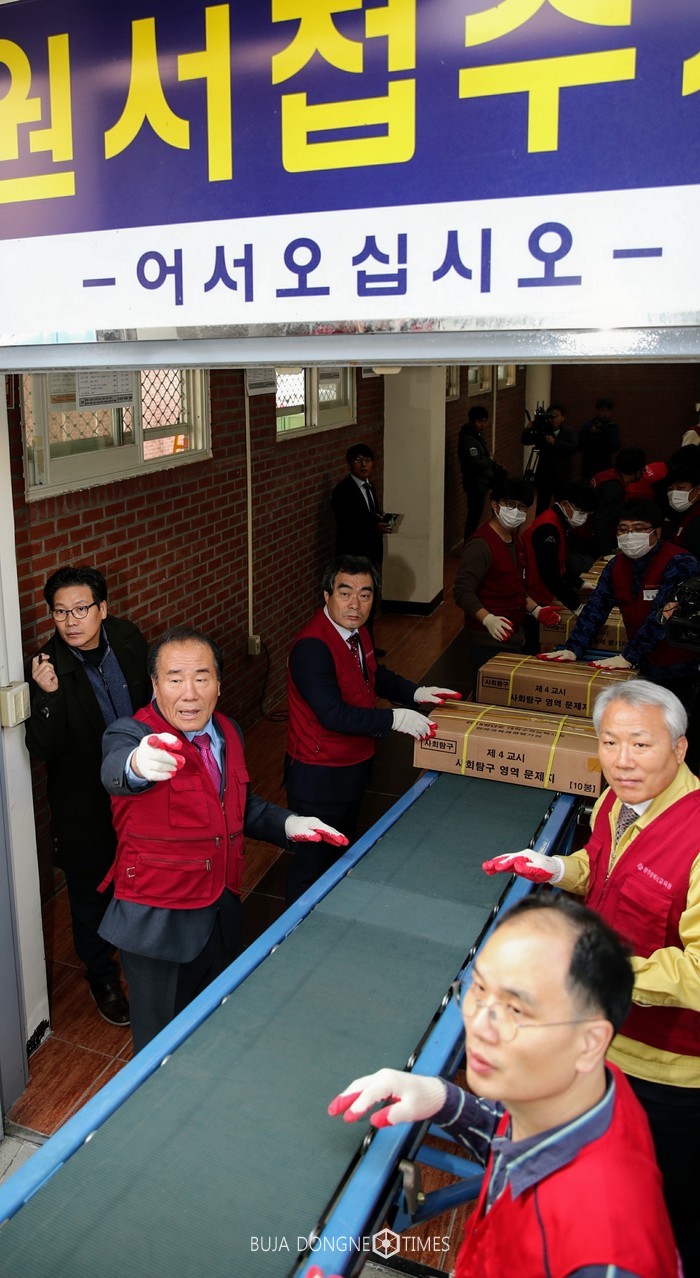 | △2018학년도 수학능력시험 문답지가 광주시교육청 원서접수처에 입고되었고 그를 직접 장휘국 교육감이 직접 분류 작업을 진행하고 있다 |