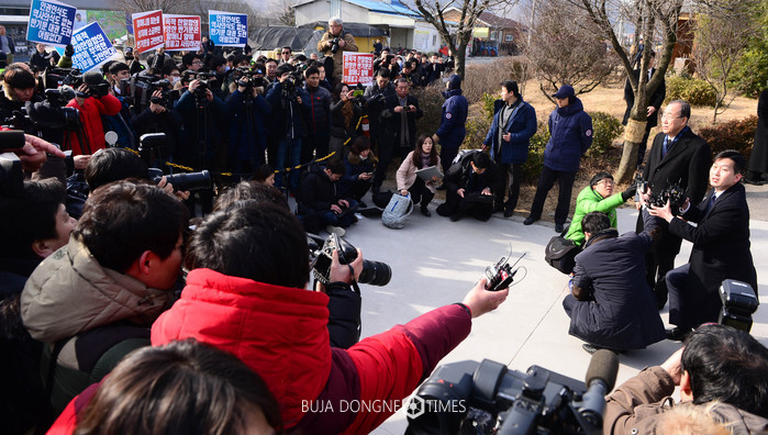반기문 전 유엔 사무총장이 17일 오전 경남 김해 봉하마을 권양숙 여사 자택 앞에서 기자회견을 갖고 있다. 한편 시민단체가 피켓을 들고 항의를 하고 있다. 2017.01.17.