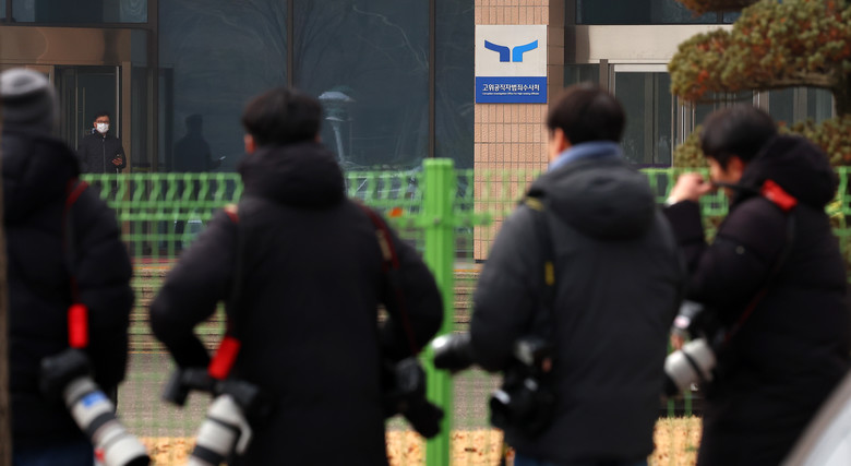 20일 오전 정부과천청사 내 고위공직자범죄수사처 앞에 취재진이 대기하고 있다.