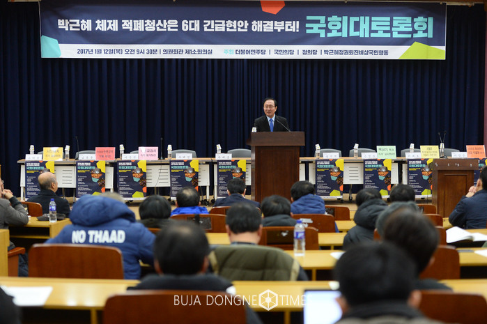 12일 오전 서울 여의도 국회 의원회관에서 열린 박근혜 정부 적폐청산과 개협입법과제 야 3당·퇴진행동 공동 토론회에서 정의당 노회찬 원내대표가 모두발언을 하고 있다. 2016.01.12.