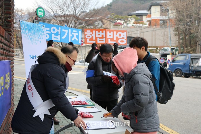 행사에 참석한 농협은행 임직원들은 “농업가치 헌법반영”안내장을 배부하고, “농업가치 헌법반영 1000만명 서명운동”에 동참해 줄 것을 호소했다.