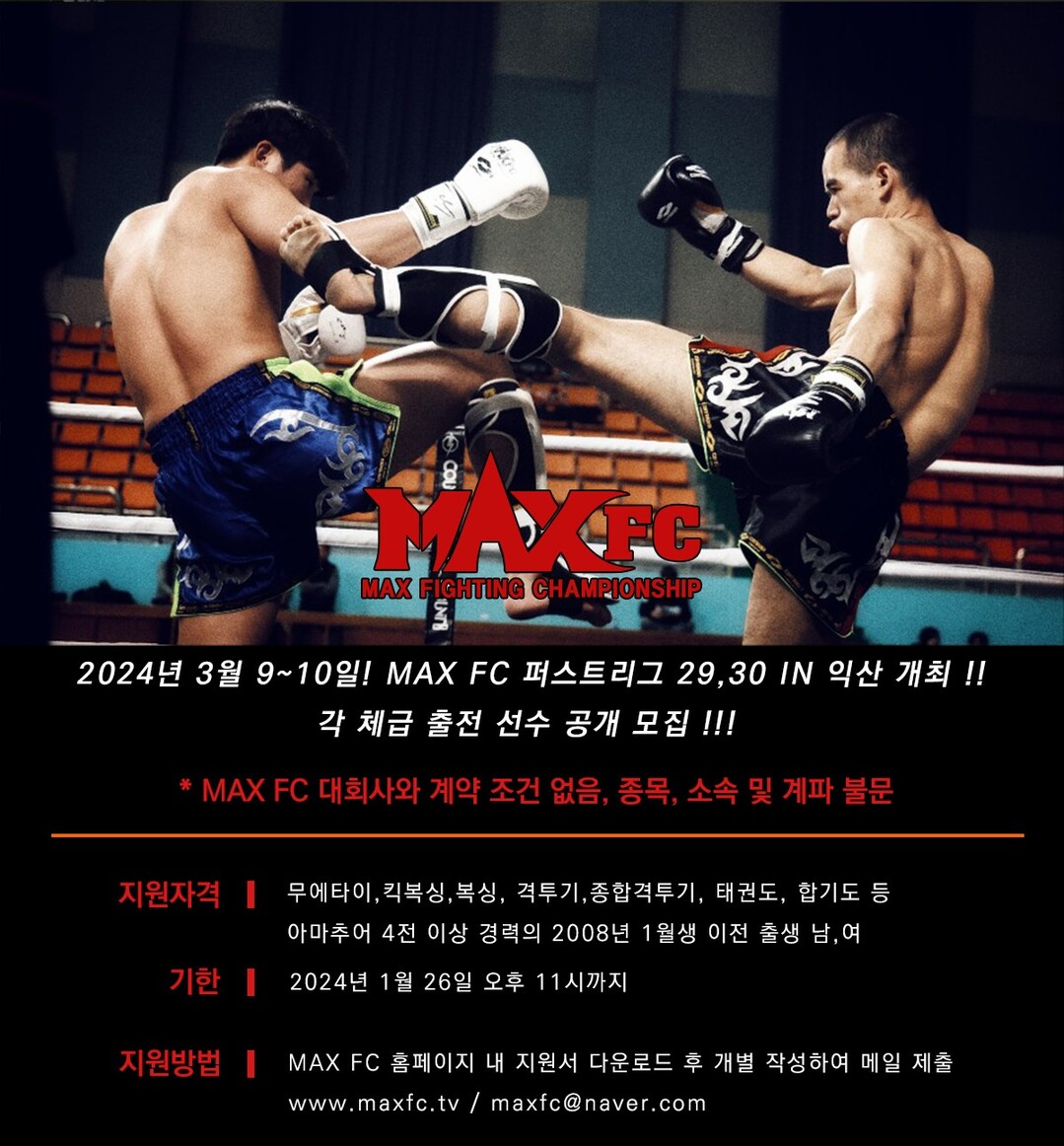 [부자동네타임즈 = 김인수 기자] 국내 최대 입식격투기 단체 MAXFC(대표 이용복)가 오는 3월 9일(토) 익산실내체육관에서 열리는 ‘MAXFC 25 IN 익산’ 대회 개최를 발표했다. MAXFC는 이번 대회의 메인 경기로, 슈퍼 미들급 챔피언 정성직(34,서울PT365)과 잠정 챔피언 장범석(28,대구팀한클럽)의 슈퍼미들급(-85kg)통합 타이틀전과 미들급 챔피언 김준화(35,안양삼산총관)와 웰터급 랭킹 1위 장준현(22,청북정심관)의 웰터급(-70kg) 타이틀전을 발표했다.