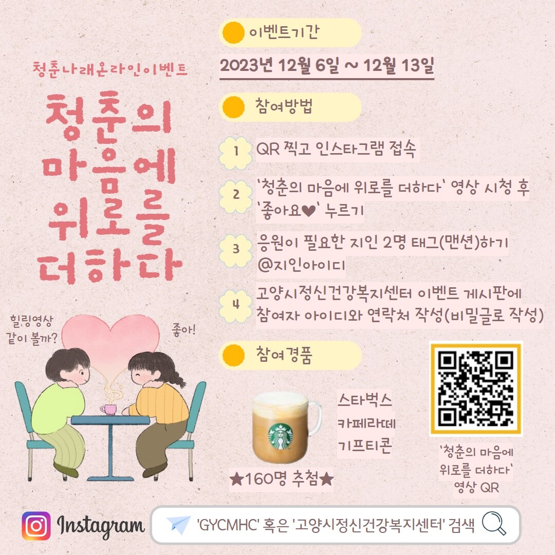 ‘청춘의 마음에 위로를 더하다’는 고양시정신건강복지센터 인스타그램에 게시된 영상을 보고 응원이 필요한 친구에게 공유하는 릴레이 캠페인이다.