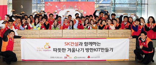 △ SK건설 관계자들이 지난 25일 서울 중구 지 플랜트 사옥에서 밀알복지재단과 희망메이커 후원가정에 보내줄 방한키트 제작 행사를 진행하며 기념사진을 찍고있다 . <사진제공=SK건설> |