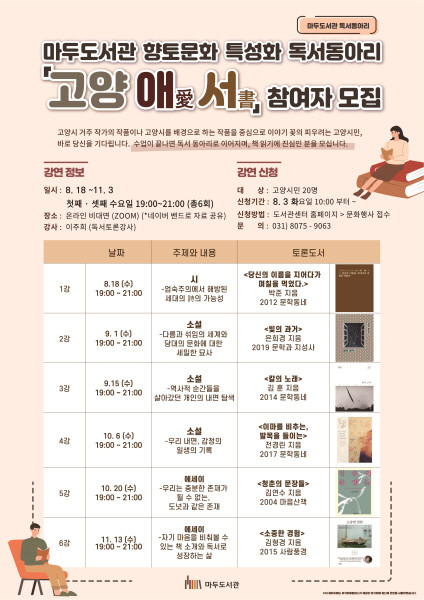 [부자동네타임즈 김인수기자] 고양 마두도서관에서 고양시 거주 작가 · 고양시를 배경으로 하는 문학 작품을 읽는 특성화 독서동아리 고양애愛서書 1기 회원을 모집한다.