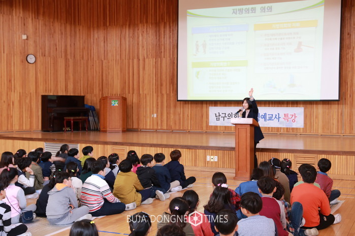 | △광주 남구의회 배진하 의원이 1일 명예교사로 나서 4일 명예교사로 나서 4일 오전 진제초등학교에서 특별수업을 실시했다 |