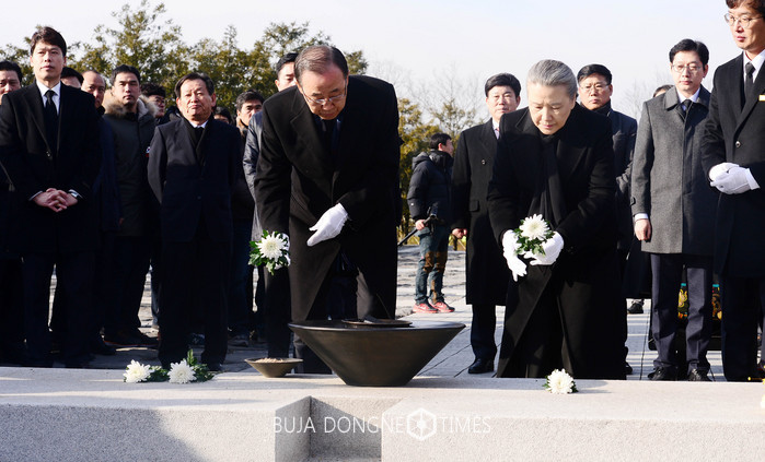 반기문 전 유엔 사무총장이 유순택 여사와 함께 17일 오전 경남 김해 봉하마을을 방문해 고 노무현 전 대통령의 묘소를 참배하고 있다. 2017.01.17.