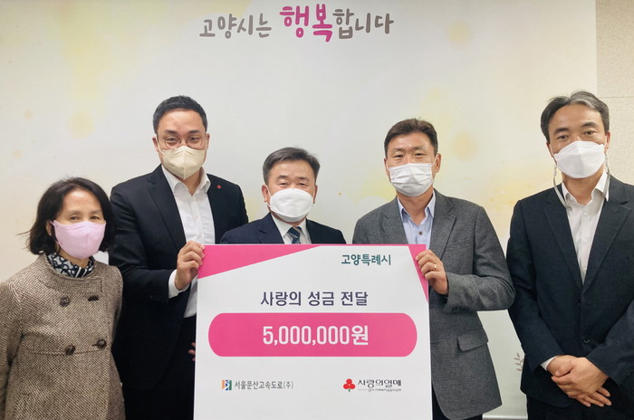 전달식에 참석한 서울문산고속도로(주) 서용성 부사장은 “고속도로를 이용하는 고양시민들과 지역사회에 보답하는 마음으로 성금을 전달했다. 성금이 어려운 이웃들에게 희망으로 전달됐으면 한다. 앞으로도 지역사회 내 다양한 복지사업에 관심을 갖겠다.”고 말했다.