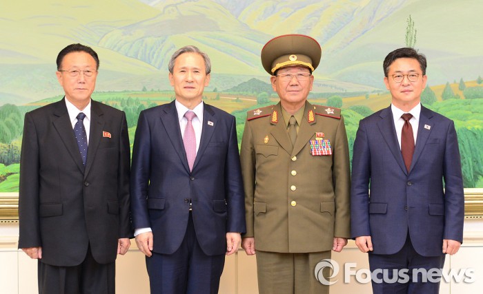 | △ 남북 고위당국자들이 지난 8월 25일 새벽 6개 항에 합의한 후 기념촬영하고 있다. 왼쪽부터 김양건 당비서, 김관진 국가안보실장, 황병서 총정치국장, 홍용표 통일부 장관. <사진제공=포커스뉴스> |