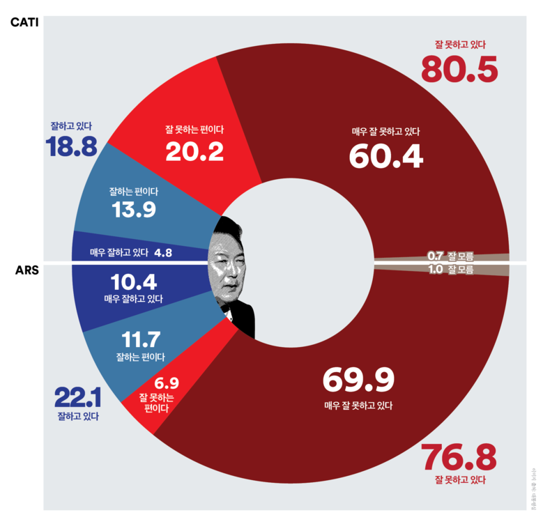 11월 8일부터 9일까지 양일간 조사한 대통령 국정운영 평가에서 전화면접조사 기준 국정운영 ‘긍정’평가는 0.6%p 상승한 18.8%, ‘부정’평가는 0.8%p 하락한 80.5%로 집계되었고 ‘긍·부정’격차는 61.7%p(1.4%p↓)로 조사되었다.
