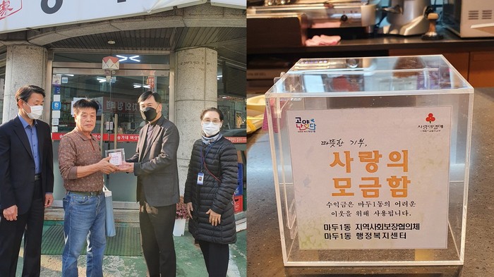 이 날 전달된‘사랑의 모금함’은 내년 연말까지 해당 영업장에 비치될 예정이며, 이를 통해 모인 성금은 사회복지공동모금회를 통해 마두1동 저소득 주민들을 위한 다양한 지역사회보장협의체 특화사업에 사용될 예정이다.