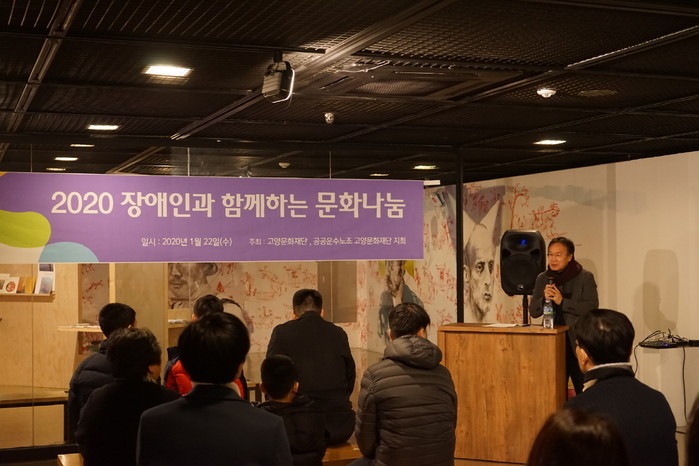 [사진설명] 지난 22일 오후 고양아람누리 아람미술관에서 정재왈 고양문화재단 대표이사(오른쪽)가 사랑의 동산 가족들에게 인사말을 전하고 있다.
