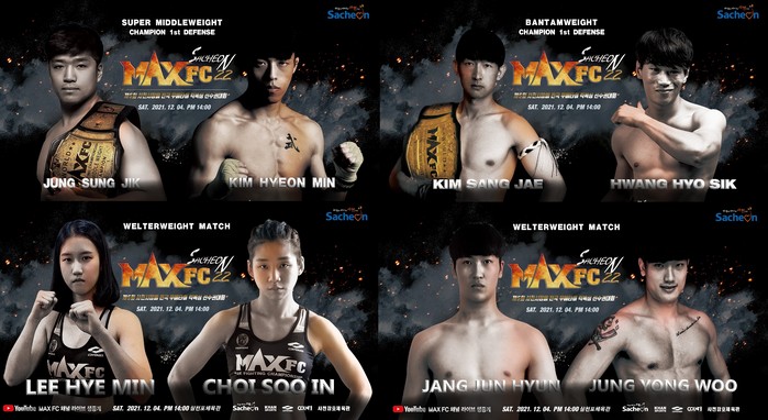 이번 'MAX FC 22 in 사천' 대회는 제5회 사천시장기 전국 무에타이 킥복싱 선수권 대회와 함께 12월 4일 경상남도 사천시 삼천포체육관에서 개최되며, 유튜브 채널 MAXFC를 통해 오후 12시부터 생중계된다.