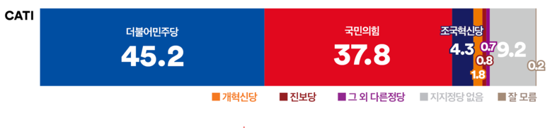 특별조사A 정당지지도: 전화면접조사 결과 ‘더불어민주당’ 45.2%로 37.8%인 ‘국민의힘’과 7.4%p 격차