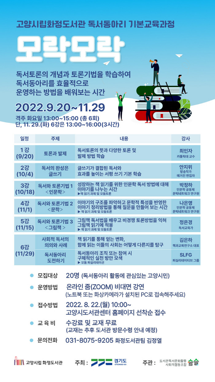 독서동아리 기본교육과정 ‘모락모락’은 평소 독서동아리에 관심 있는 시민을 대상으로 운영된다. 독서토론의 개념과 토론기법, 독서동아리 조직 및 참여의 구체적인 실천방안 등 시민 스스로 독서동아리를 효율적으로 운영할 수 있는 방법을 배워보는 시간이 될 예정이다.