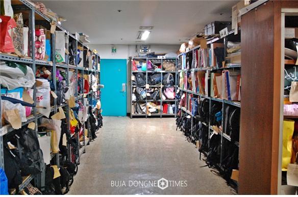 사진셜명:지하철 유실물센터 선반이 배낭, 쇼핑백 등 유실물로 가득 차 있다.