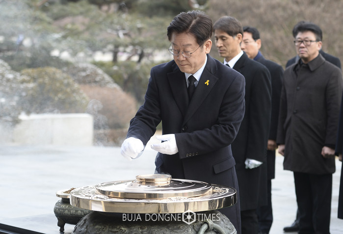 이재명 성남시장이 31일 오전 서울 동작구 국립서울현충원 현충탑을 찾아 참배, 분향하고 있다. 이날 이 성남시장은 방명록을 작성하며 자신을 더불어민주당 대통령 경선후보라고 적었다. 2017.01.31.