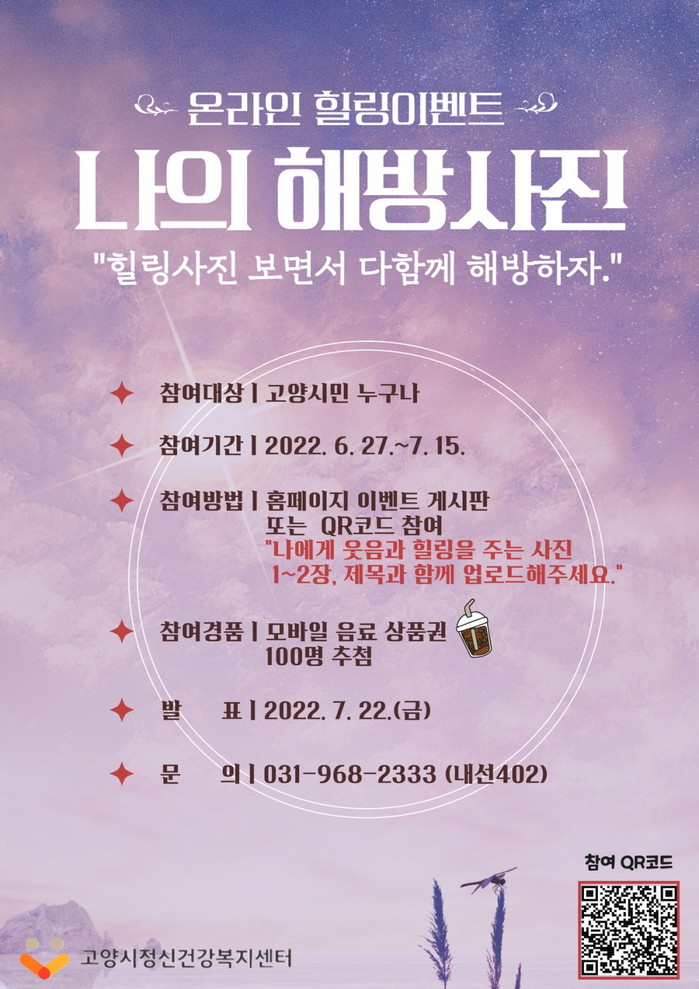 이벤트 참여는 나에게 웃음과 힐링을 주는 사진을 제목과 함께 업로드하면 된다. 이벤트는 고양시정신건강복지센터 홈페이지 이벤트 게시판 혹은 QR코드 접속을 통해 참여 가능하다. 응모자 중 추첨을 통해 100명에게 모바일 음료 쿠폰을 제공한다.