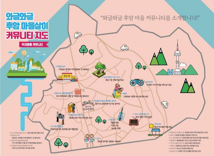 특히 마을공동체 ‘와글와글 후암인’은 앞뒤로 ‘커뮤니티 지도’와 ‘문화마을 지도’를 담은 마을지도를 500부 제작, 주민들에게 배부하고 지역의 다양한 소모임과 산책코스를 주민들에게 소개한다.