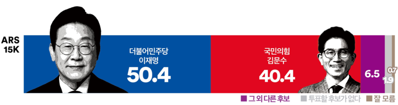 이번 대선에서 누구에게 투표할 것인지 묻는 양자 가상대결 질문에 대해, 더불어민주당 ‘이재명’ 후보는 50.4%의 지지율을 기록해 국민의힘 ‘김문수’ 후보(40.4%)보다 10.0%p 높게 나타났다. ‘그 외 다른 인물’은 6.5%, ‘투표할 인물이 없다’는 응답은 1.9%였다.