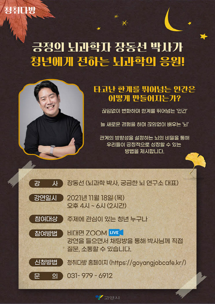 [부자동네타임즈 김인수기자] 고양시 청취다방(청년들의 취업과 소통이 있는 수다방)이 11월 18일 뇌 과학자 장동선 박사를 초청하여 명사 특강을 진행한다.