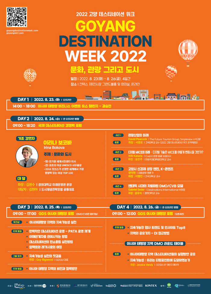‘2022 고양 데스티네이션 위크’는 1일차 ‘제1회 아시아 태평양 비즈니스 이벤트 유스 챌린지’, 2일차 ‘국제 데스티네이션 경쟁력 포럼’ 및 개막식, 3일차 ‘GDS 아시아 태평양 포럼(아시아-태평양 지역 DMO/CVB대상)’ 그리고 4일차에는 ‘GDS 아시아 태평양 포럼(일반세션)’ 및 관광 프로그램으로 구성될 예정이다. 2일차와 4일차 행사는 온라인과 오프라인 동시의 하이브리드로 운영되는 만큼 온라인 참여도 가능하다.