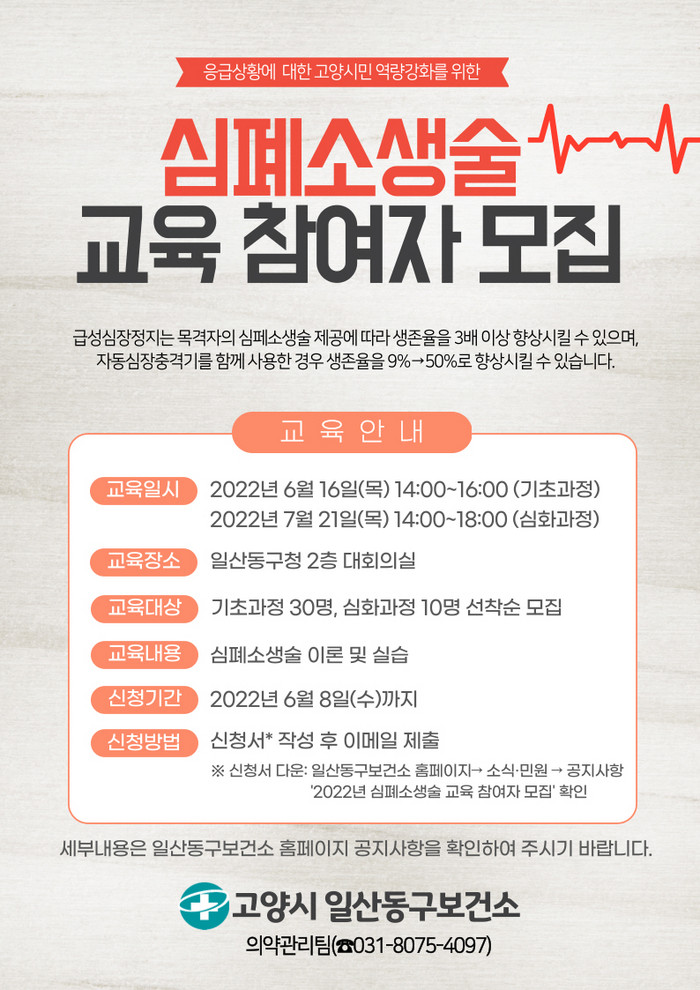 [부자동네타임즈 김인수기자] 고양시 일산동구보건소가 6월부터 심폐소생술 법정의무교육대상자 및 일반인을 대상으로 심폐소생술 등 응급처치 교육을 시행한다.