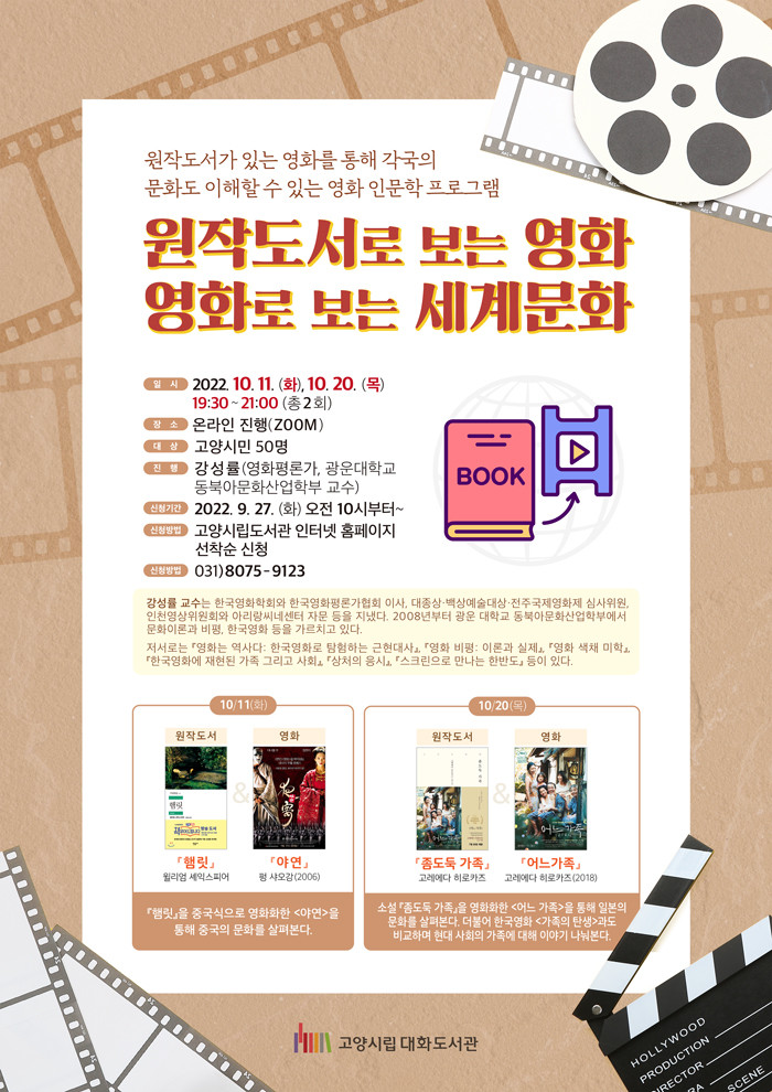 프로그램은 고양시민 50명을 대상으로 총 2회에 걸쳐 10월 11일(화), 10월 20일(목) 오후 7시 30분부터 9시까지 온라인 줌(zoom)으로 운영한다. 첫 번째 시간에는 원작도서 『햄릿』을 중국식으로 영화화한 <야연>을 통해 중국의 문화를 살펴본다. 두 번째 시간에는 소설 『좀도둑 가족』을 영화화한 <어느 가족>을 통해 일본의 문화를 살펴볼 뿐만 아니라 한국 영화 <가족의 탄생>과도 비교하며 현대 사회의 가족에 대해 이야기를 나눠 볼 예정이다.