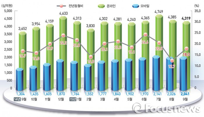 온라인쇼핑 거래액 중 모바일쇼핑 거래액은 2조410억원으로 전년 동월 대비 56.6% 늘었다. 8월 대비 온라인쇼핑 거래액은 1.5% 감소했지만 모바일쇼핑 거래액은 오히려 0.7% 증가했다.