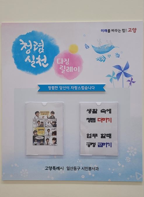 [부자동네타임즈 김인수기자] 고양특례시 일산동구는 청렴 문화 정착을 위한 다짐의 마음을 담아 시민봉사과 사무실 내에 ‘청렴실천 다짐 릴레이’ 안내판을 설치 및 운영한다고 24일 밝혔다.