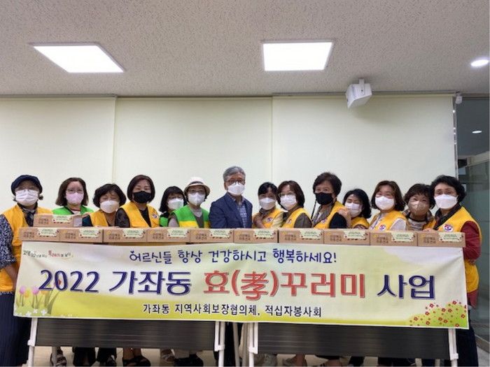 이번 행사는 가좌동 지역사회보장협의체가 주관하고 적십자봉사회가 참여하는 2022년 경로잔치 대안 사업으로 어르신을 공경하는 마음을 담아 효(孝)꾸러미를 제작했으며, 만 80세 이상 고령 어르신들은 위원이 직접 가정을 방문해 꾸러미를 전달하며 안부를 살필 예정이다.