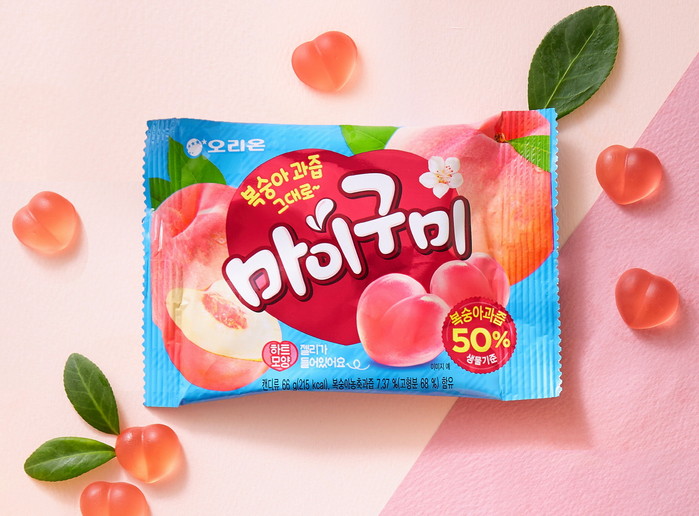 마이구미 복숭아는 1991년 출시된마이구미가포도맛에 이어26년 만에새롭게 선보인신제품. 원물 기준 50%에 달하는 복숭아과즙을 넣어 복숭아 본연의 진한 달콤함을 살렸다.
