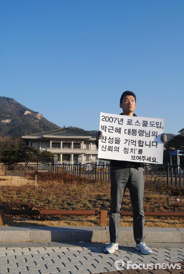 △ 장시원(서울대학교 법학전문대학원 2학년) 학생이 7일 오전 서울 종로구 청와대 분수대 앞에서 1인 시위를 하고 있다. <사진제공 =서울대학교 법학전문대학원 총학생회> |