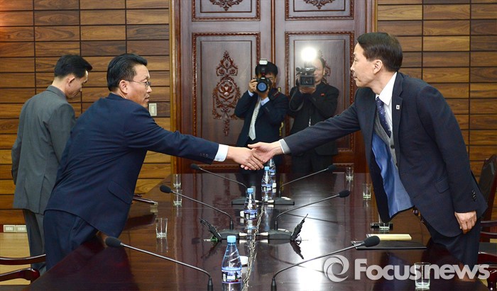 | △ 26일 판문점 통일각에서 김기웅(오른쪽) 통일부 남북회담본부장과 황철 북한 조국평화통일위원회 서기국 부장이 남북 당국회담 준비를 위한 실무접촉을 하고 있다. <사진제공=통일부> |