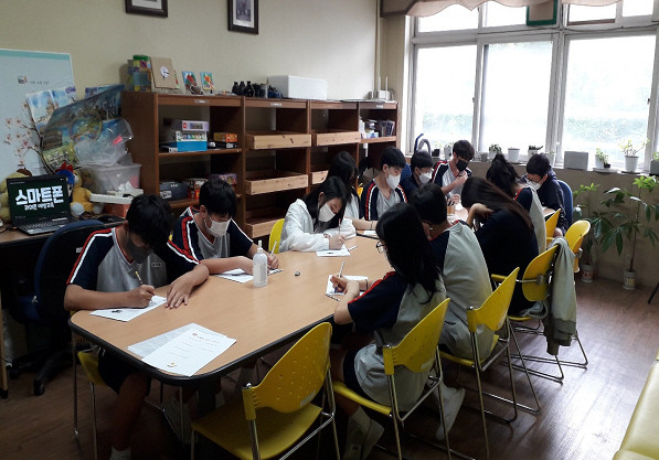 [사진설명] 2022년도 행신중 인터넷·스마트폰 과의존 예방해소 사업 집단상담 모습.