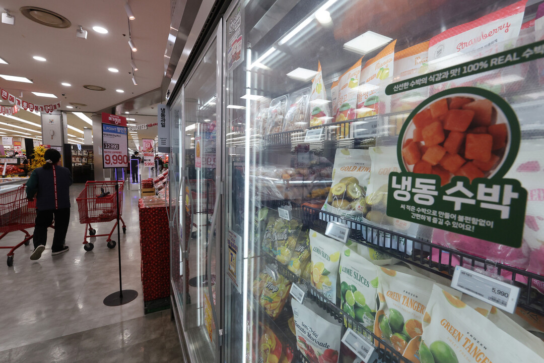 [부자동네타임즈 = 서소민 기자] 중동전쟁으로 인해 수입 과일 시장이 고환율의 직접적 영향을 받는 가운데 5일 서울의 한 대형마트에 냉동과일이 진열돼있다.