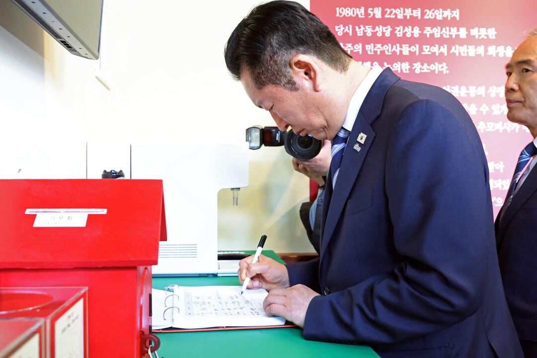 광주 5·18 기념성당서 소감 적는 정청래 대표